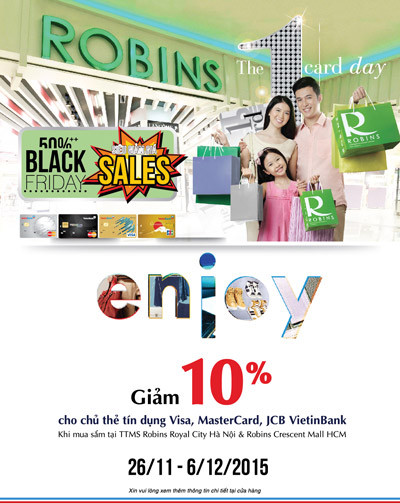 Mỗi khách hàng được nhận tối đa 2.000.000 đồng khi tham gia các Chương trình khuyến mãi hợp tác giữa VietinBank và TTMS Robins triển khai trong khoảng thời gian từ 23/4/2015 đến 3/1/2016 (Chi tiết từng CTKM được công bố trên website của VietinBank).