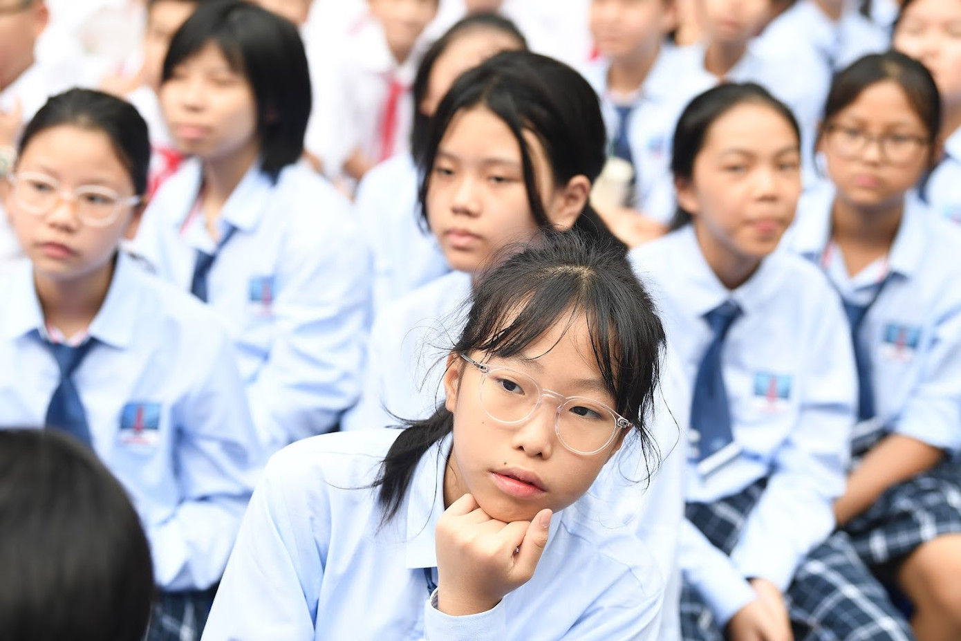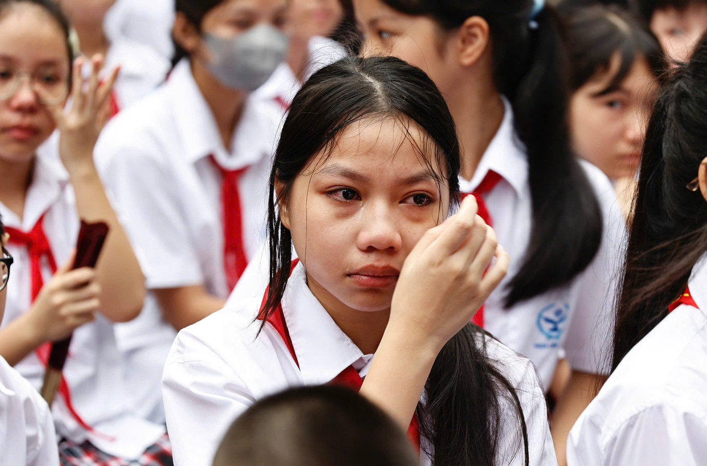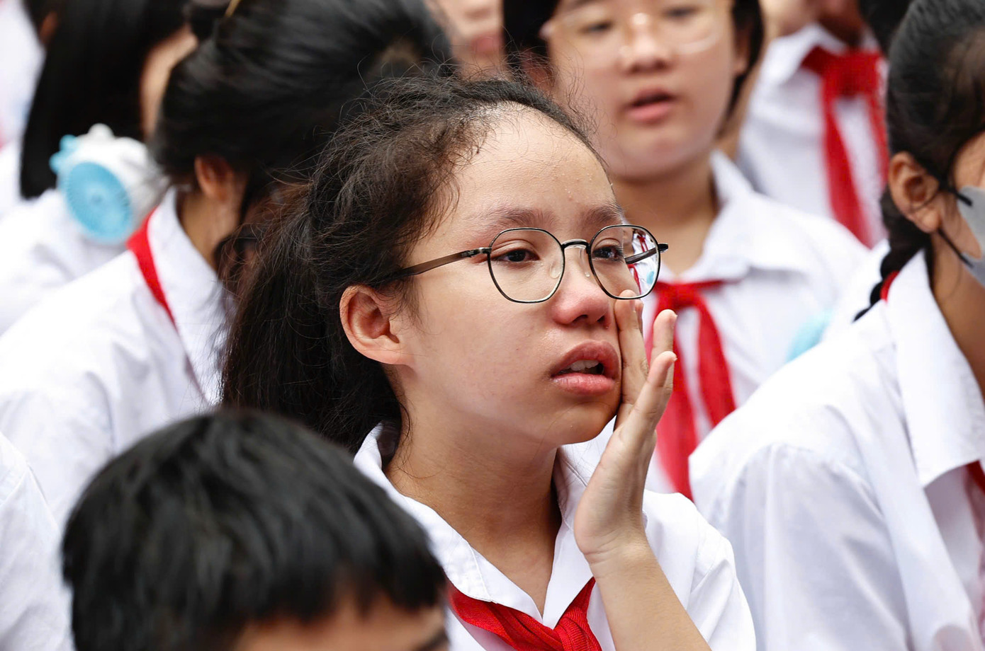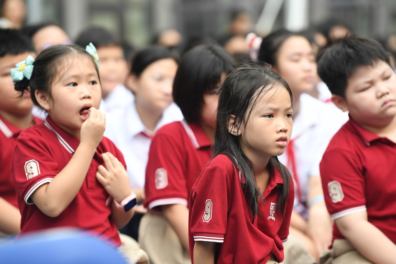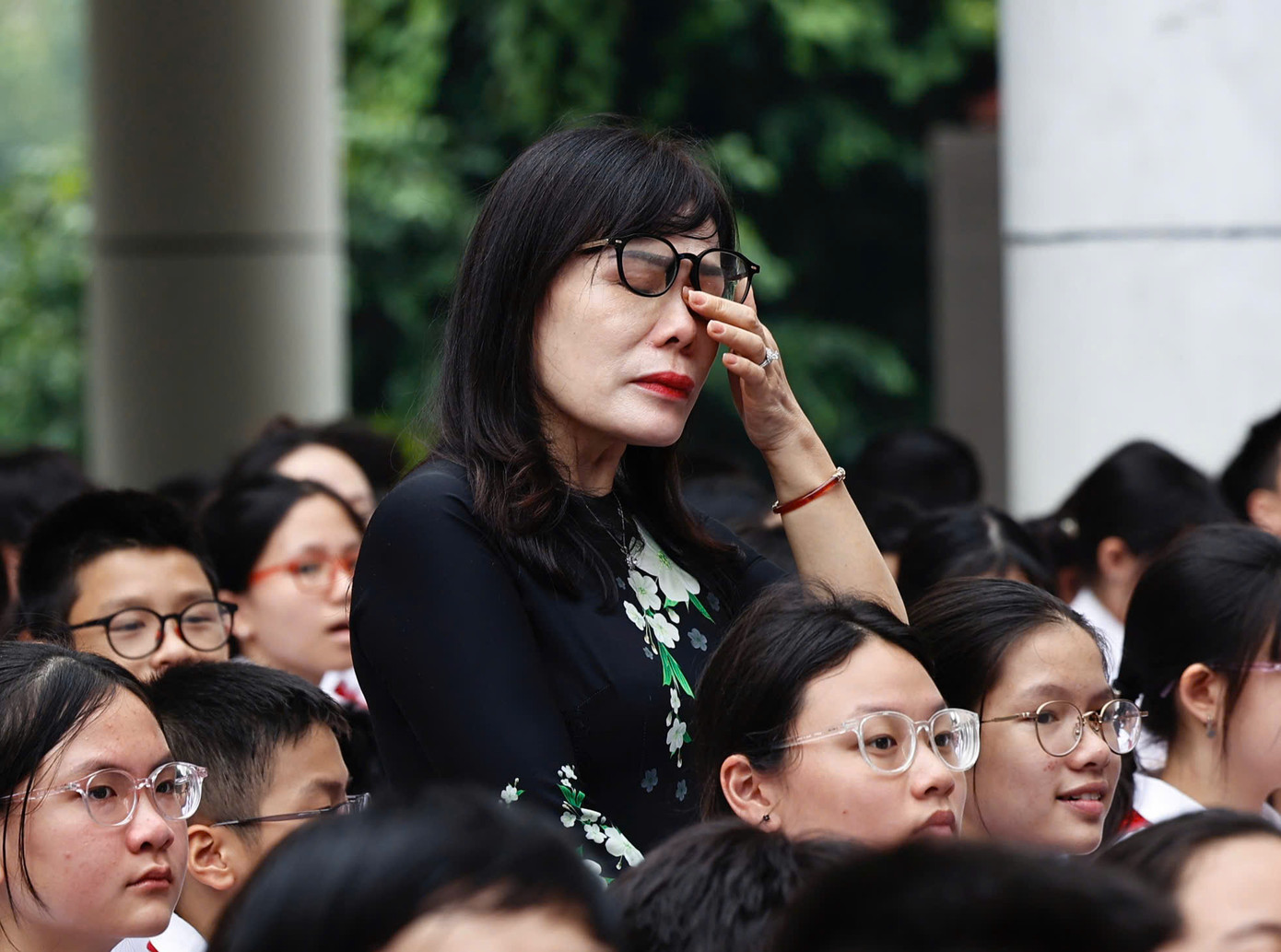 Sau lễ chào cờ, các đại biểu, các thầy cô, các em học sinh có mặt tại sân Trường THCS Cầu Giấy dành 1 phút tưởng niệm hơn 300 nạn nhân thiệt mạng do ảnh hưởng của cơn bão số 3 (bão YAGI) vừa qua.