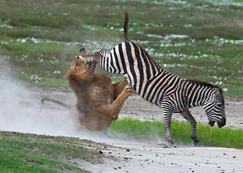 Cũng không ít lần, ngựa vằn vận dụng thành công món đòn đá hậu của mình. Trong ảnh, ngựa vằn đá lật hàm sư tử để chạy thoát thân.
