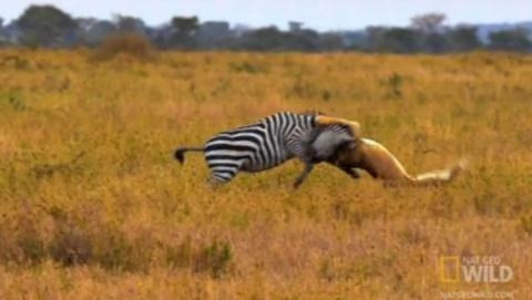 Còn chú ngựa vằn này nhanh trí rẽ hướng khi con sư tử đang chuẩn bị tung cú vồ mồi, khiến con vật loạng choạng suýt ngã nhào.