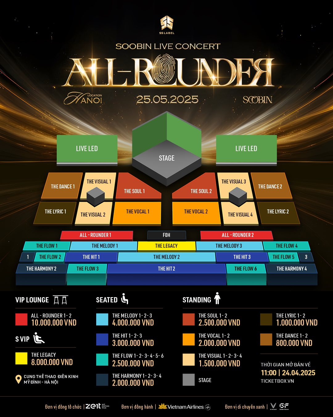 Giống như D-1, ở D-2 của SOOBIN LIVE CONCERT: ALL ROUNDER cũng có 11 hạng vé, với giá vé từ 800K đến 10 triệu đồng.