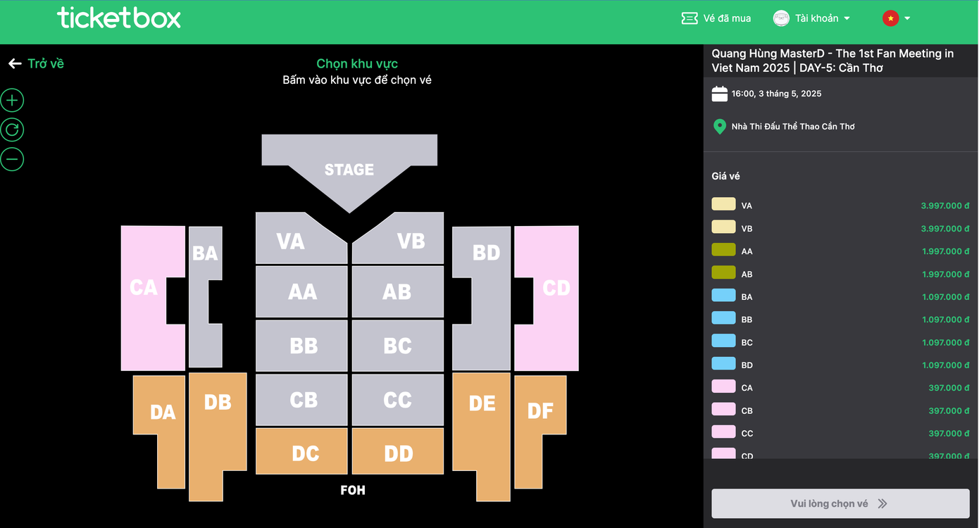 Còn tại fan meeting D-5 tổ chức tại Nhà thi đấu thể thao Cần Thơ vào ngày 3/5 có lẽ là sự kiện hiếm hoi mà các Muzik cảm thấy dễ thở khi "săn vé". Mở bán rộng rãi từ ngày 19/4, đến nay fan meeting D-5 của Quang Hùng vẫn sót lại một số khu vực còn vé.