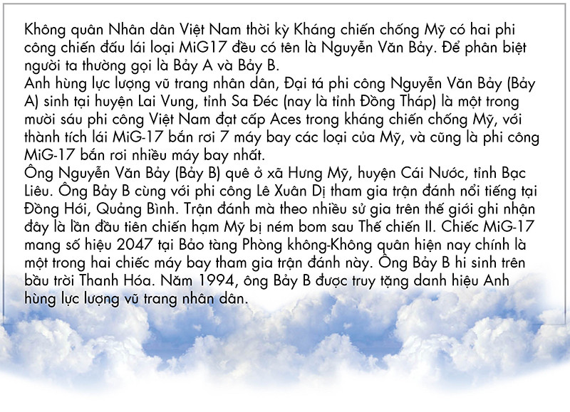 | Phi công Nguyễn Văn Bảy là chiến sĩ không quân đầu tiên được bầu vào Quốc hội (khóa IV và nửa nhiệm kỳ V thì miền Nam hoàn toàn giải phóng – PV), là một trong ba phi công được Bác Hồ tuyên dương Anh hùng lực lượng vũ trang nhân dân trong đợt tuyên dương anh hùng thời chống Mỹ cứu nước đầu tiên ở miền Bắc... Khi được tuyên dương Anh hùng, phi công Nguyễn Văn Bảy mới mang cấp hàm Thượng úy. |
