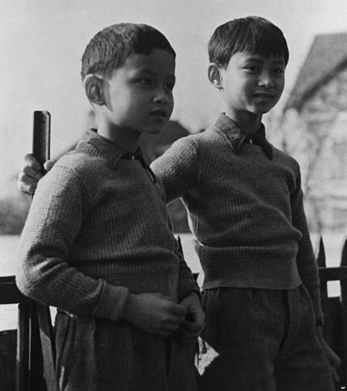 Ông Bhumibol Adulyadej sinh năm 1927 ở Massachusetts, Mỹ, sau đó học tập tại Thụy Sĩ. Trong ảnh, ông và anh trai Ananda Mahidol (phải) tại trường học ở Thụy Sĩ năm 1935. Ông lên ngôi vào ngày 9/6/1946 lúc 18 tuổi, sau khi quốc vương Ananda Mahidol, tử vong ở tuổi 20 trong cung điện ở Bangkok.