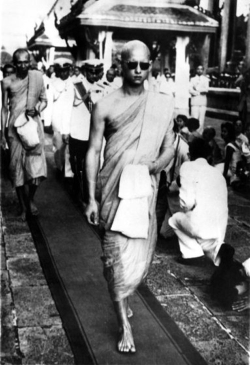Ông Bhumibol cạo đầu và mặc áo cà sa vàng rời khỏi một ngôi chùa ở Bangkok sau khi được thụ phong như một nhà sư vào năm 1956. Trong hai tuần, ông đã đi khất thực khắp các con phố và lên xe lái đi bất cứ khi nào có người nhận ra nhà vua.