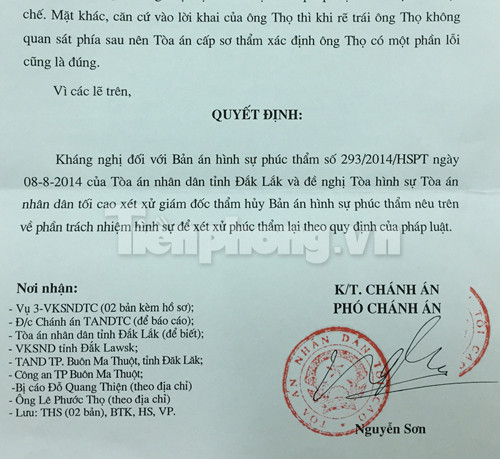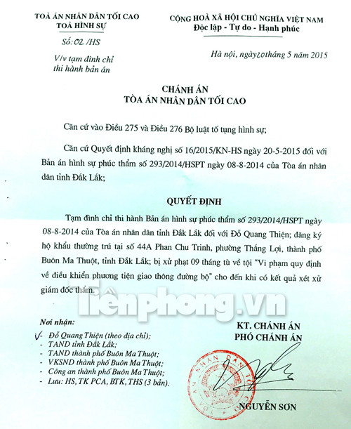 Ngay trong ngày 20/5, Phó Chánh án TAND Tối cao Nguyễn Sơn đã ký Quyết định tạm đình chỉ thi hành án đối với Thiện, và Quyết định kháng nghị bản án cấp phúc thẩm của TAND tỉnh Đắk Lắk, đề nghị Tòa Hình sự TANDTC xử giám đốc thẩm, hủy bản án hình sự phúc thẩm về phần trách nhiệm hình sự để xét xử phúc thẩm lại theo quy định của pháp luật.