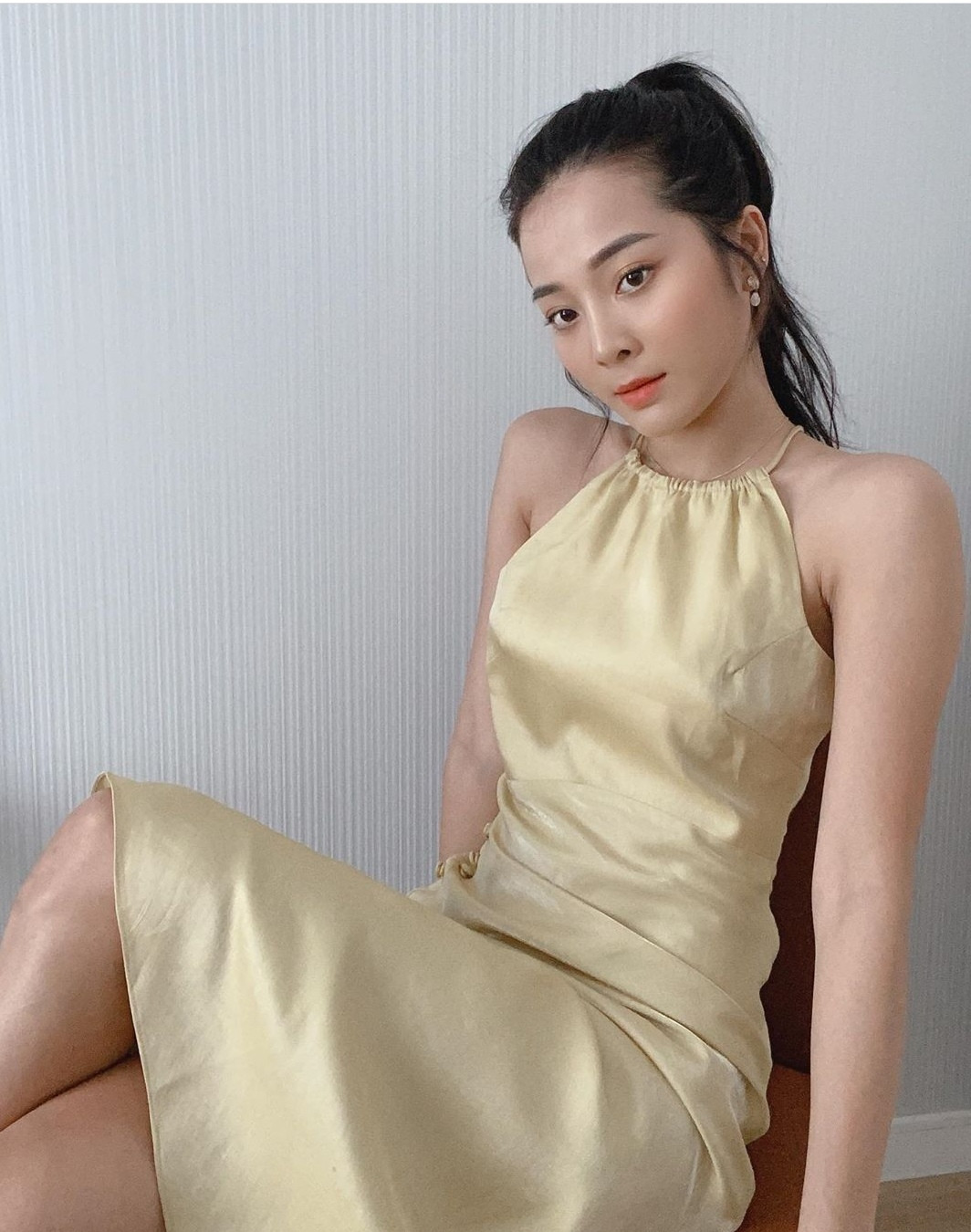 Karen Nguyễn đơn giản mà vẫn xinh với váy cổ yếm màu vàng nhạt tinh tế.