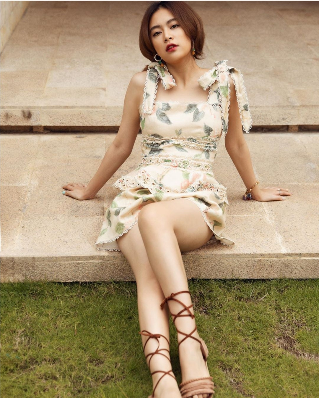 Hoàng Thùy Linh xuống phố với váy hai dây bản to họa tiết hoa lá và giày sandal màu da bò thắt dây thời trang.