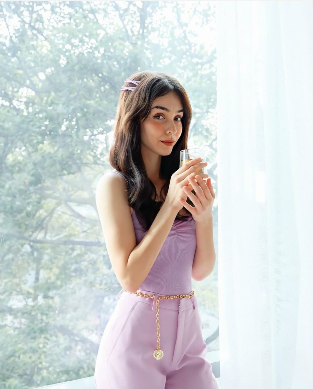 Mlee cũng bắt trend không kém với cả cây màu tím bơ phối cùng thắt lưng dây xích và kẹp tóc tím xinh xắn.