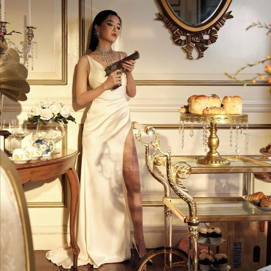 Bích Phương cực chất với style badgirl khi chọn váy hai dây dài xẻ tà phối cùng trang sức bắt mắt.
