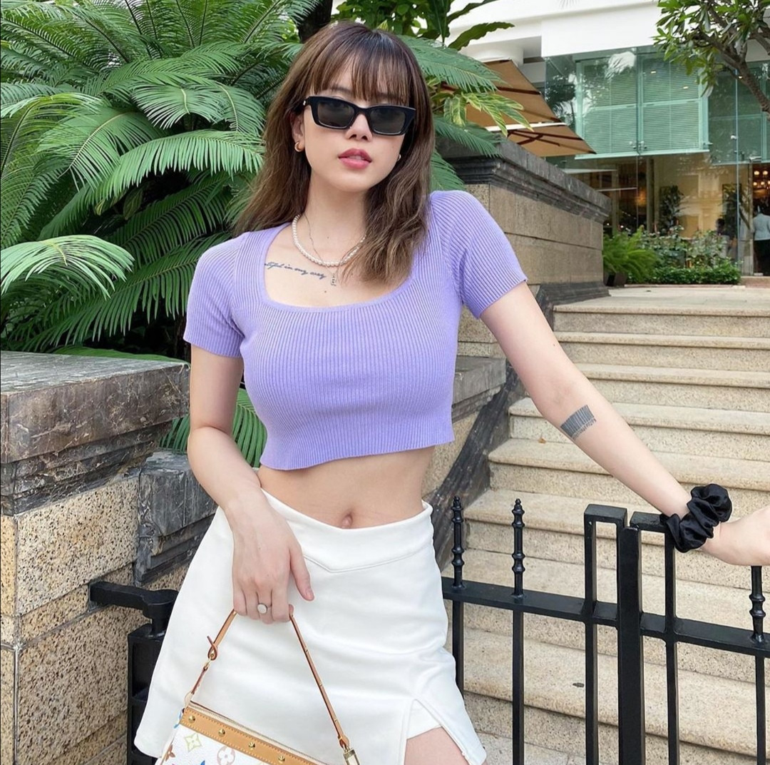 Thiều Bảo Trâm bắt trend màu tím bơ đang siêu hot, nữ ca sĩ chọn áo thun croptop cổ vuông phối cùng chân váy đắp tà màu trắng ra phố.