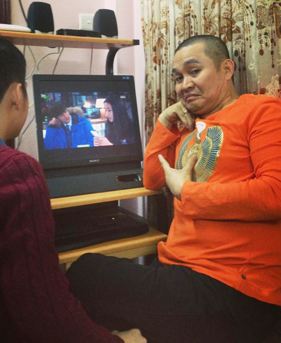Xuân Hinh xem phim cùng con trai.