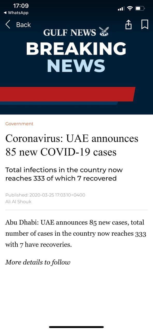 UAE cũng trong tình trạng giống Việt Nam, nghĩa là số ca nhiễm được kiểm soát tốt là 13 trường hợp trong một thời gian dài. Nhưng sau đó do lượng người từ tâm dịch Iran tràn về quá lớn, và giải đua xe đạp UAE Tour phát hiện 2 nhân viên người dương tính, thế là số ca nhiễm bắt đầu tăng nhanh, chỉ trong 2 tuần mà lên hơn 300 ca.