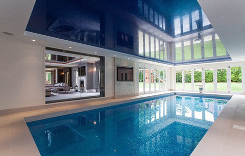 Bể bơi trong nhà được bao bọc bởi các tấm kính, nhìn ra được phòng khách và khu vườn