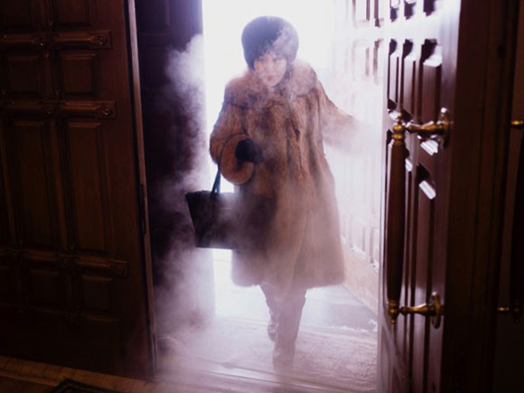 Một phụ nữ địa phương bước vào nhà thờ Preobrazhensky trong làn sương giá