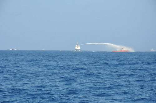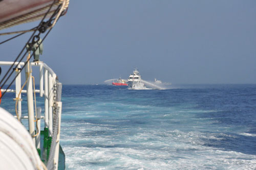 Sau vài vòng lượn vòng quanh con tàu kiểm ngư nhỏ bé, líu lo chĩa loa phóng thanh công suất lớn hù dọa giọng xấc xược: “Tàu 767. Đây là vùng biển Trung Quốc. Các bạn phải rời khỏi đây ngay lập tức!” và gào lên: “Chúng tôi sẽ dùng biện pháp mạnh!”, tàu Hải cảnh 21101 lùi ra sau như sắp giở trò xấu gì đó.