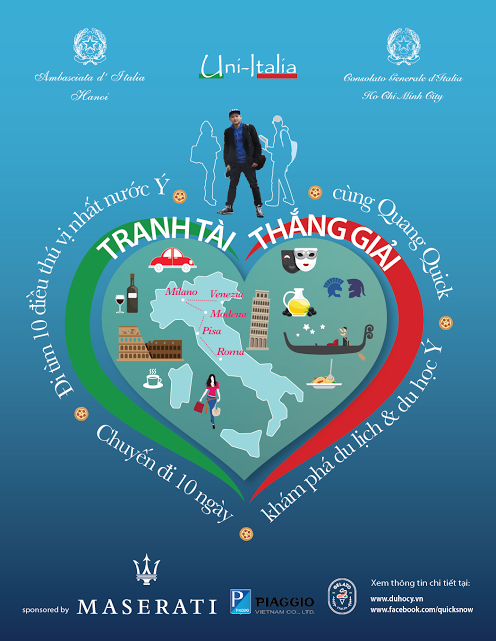 Cuộc thi nhận được sự hợp tác của phát thanh viên và blogger Quang Quick cùng những hỗ trợ từ phía các trường Đại học của Ý, nhà tài trợ vàng Maserati, hai nhà đồng tài trợ Piaggio và Gelato Italia. Các thí sinh giành chiến thắng sẽ có cơ hội tới nước Ý thăm các trường Đại học và khám phá 10 điều thú vị nhất trong 10 ngày cùng Quang Quick.