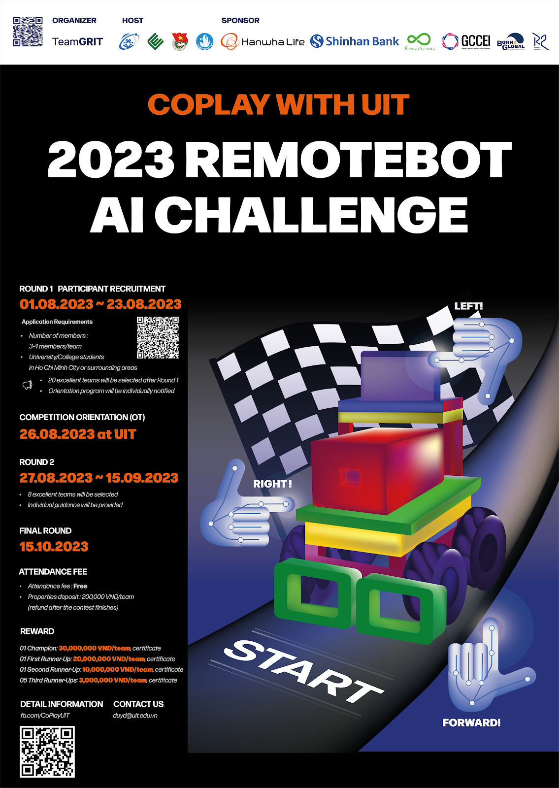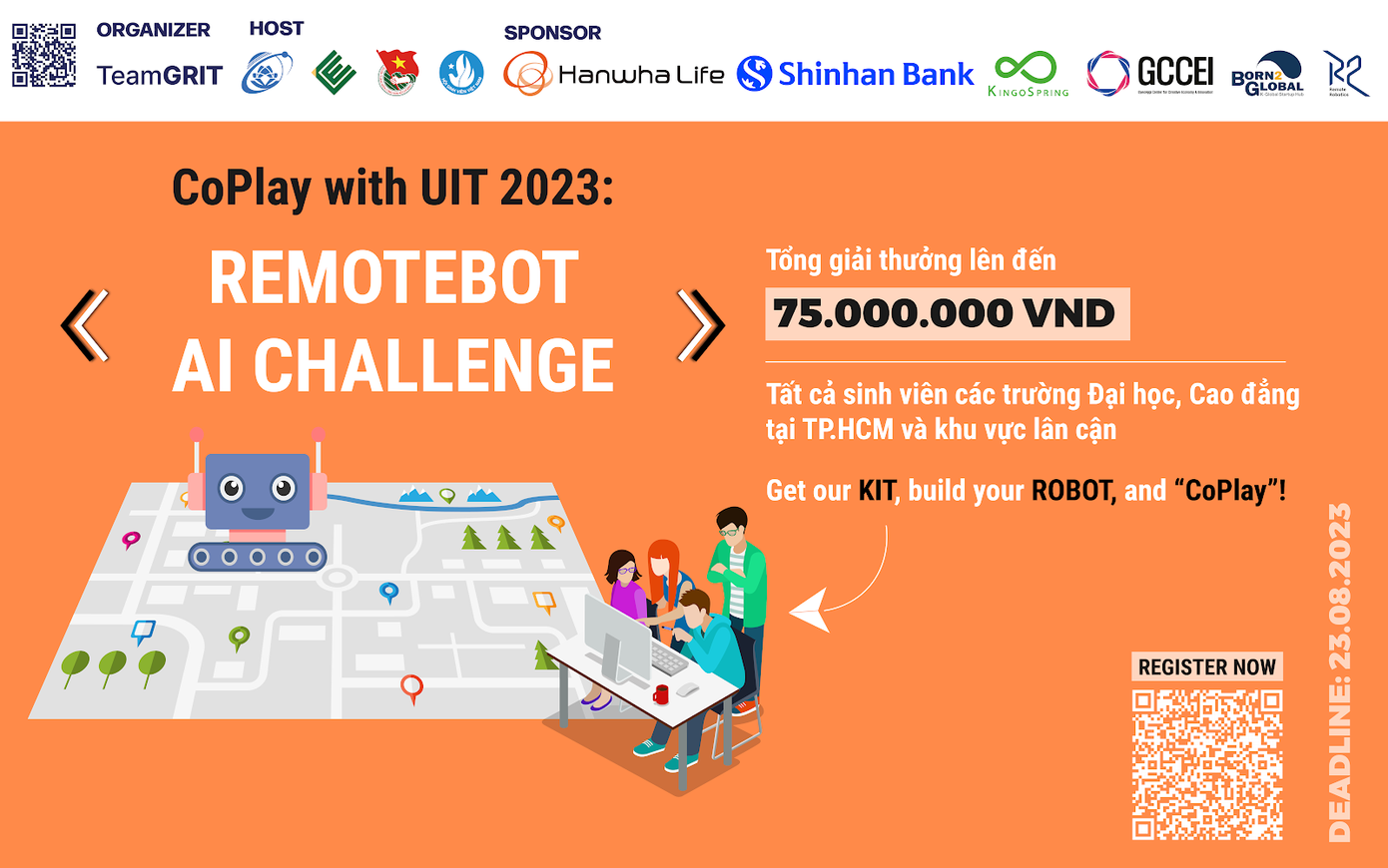 CoPlay with UIT 2023 là cuộc thi do Khoa Kỹ thuật Máy tính, Trường Đại học Công nghệ Thông tin, ĐHQG-HCM phối hợp cùng công ty TeamGRIT (Hàn Quốc) thực hiện với mong muốn mang đến một sân chơi hấp dẫn và đầy thử thách cho các bạn đam mê công nghệ robot và trí tuệ nhân tạo.