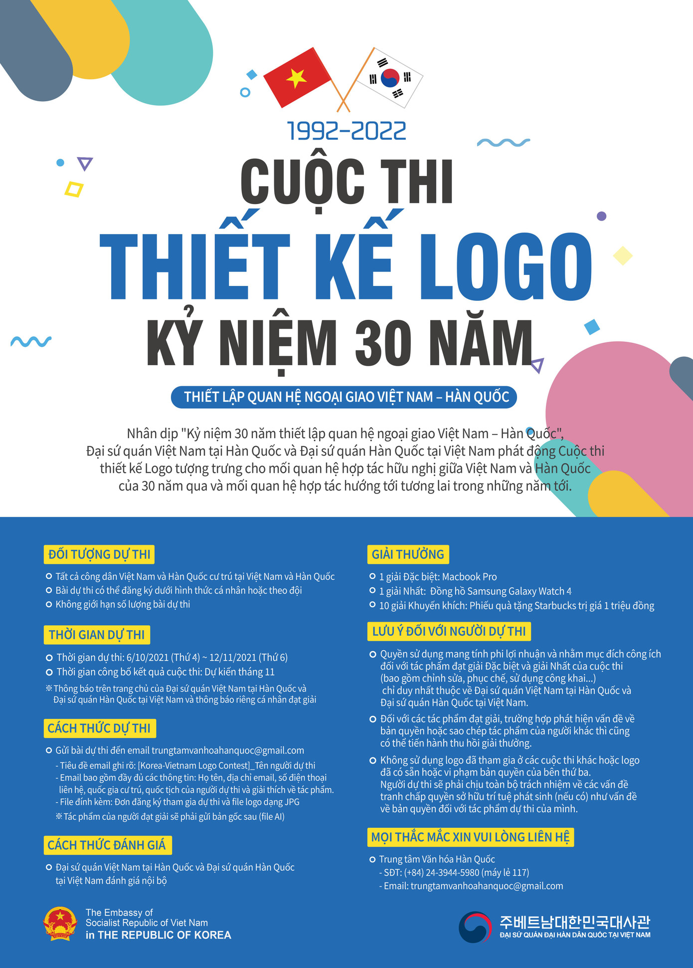Cách thức dự thi vui lòng xem chi tiết tại trang chủ của Đại sứ quán Việt Nam tại Hàn Quốc và Đại sứ quán Hàn Quốc tại Việt Nam, bài dự thi gửi về email trungtamvanhoahanquoc@gmail.com cùng tiêu đề email ghi rõ: [Korea-Vietnam Logo Contest]_Tên người dự thi, bao gồm đầy đủ các thông tin: Họ tên, địa chỉ email, số điện thoại liên hệ, quốc gia cư trú, quốc tịch của người dự thi và giải thích về tác phẩm. File đính kèm bao gồm: Đơn đăng ký tham gia dự thi và file logo dạng JPG (không quá 3MB). Tác phẩm đạt giải sẽ được sử dụng làm logo chính thức của Đại sứ quán Việt Nam tại Hàn Quốc và Đại sứ quán Hàn Quốc tại Việt Nam trong năm 2022.