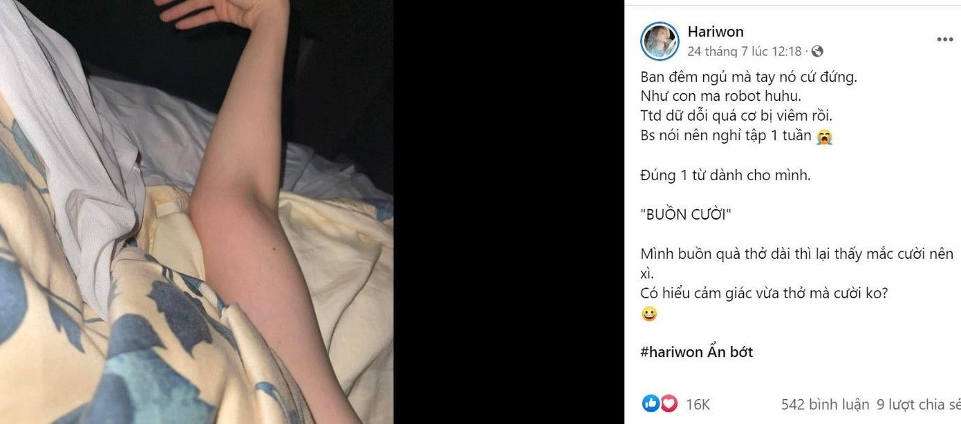 Nói về căn bệnh mình đang mắc phải, bà xã Trấn Thành nói: “Tay mình sưng mà quá trời sưng. Bắp tay của mình như 1 quả bong bóng đầy nước. Bác sĩ chẩn đoán mình bị viêm cơ cả hai tay. Tại thời điểm đó, mình cảm giác mặt không được thoải mái, 1 bên kiểu như đơ đơ. Sau đó thì Hari cảm thấy người mệt mỏi”. Hiện tại, nữ ca sĩ đang tập trung điều trị bệnh.