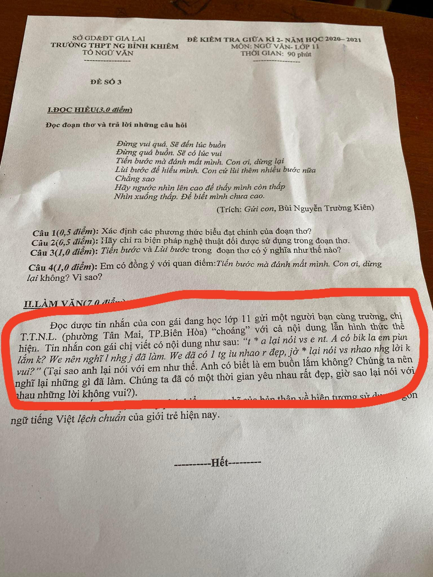 Mới đây, trong đề kiểm tra môn Ngữ văn giữa học kì 2 năm học 2020 - 2021 dành cho các bạn học sinh lớp 11 trường THPT Nguyễn Bỉnh Khiêm (Gia Lai) đã có câu hỏi liên quan đến ngôn ngữ của giới trẻ ngày nay, câu hỏi này được đưa ra dưới dạng tình huống để các bạn học sinh tự phân tích cũng như nêu quan điểm của mình.