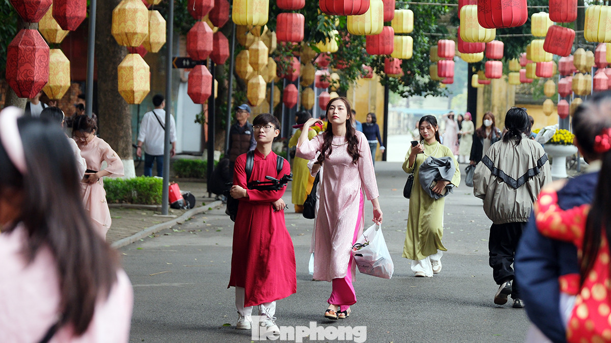 | Nhiều bạn trẻ chọn áo dài với những phụ kiện cũng như hoa tươi đậm chất Tết Việt truyền thống để chụp ảnh. |