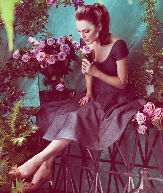 Dưới ống kính của nhiếp ảnh gia Mert và Marcus, Julianne hiện lên tính tế và sang trọng trong khu vườn lãng mạn tràn ngập hoa hồng tím.