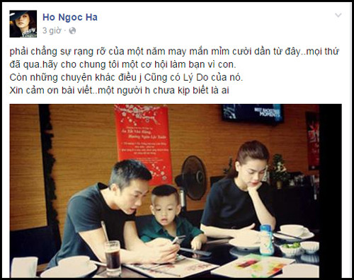 Có thể nói, dòng trạng thái này như câu trả lời đồng ý cho đề nghị 'được làm bạn' của Hà Hồ. Cách đây không lâu, người đẹp từng chia sẻ: 'Mọi thứ đã qua. Hãy cho chúng tôi cơ hội làm bạn vì con'.