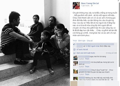 Thời điểm "tâm bão", Cường nhẹ nhàng đăng ảnh kèm lời bày tỏ: "Chuyện không may xảy ra là điều chẳng ai mong muốn. Mỗi gia đình mỗi cảnh, xã hội mỗi người mỗi kiểu. Cháu chân thành cảm ơn cô và các anh chị trong gia đình đã thấu hiểu và cảm thông cho câu chuyện không may vừa xảy ra! ... Cháu và gia đình sẽ làm tất cả những gì có thể, mong bác trai và các anh chị nạn nhân sớm bình phục...".