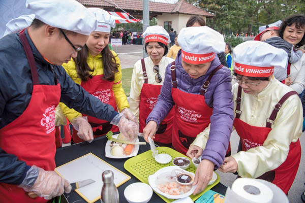 Các chị em phụ nữ Vinhomes cũng không bỏ qua cơ hội trở thành ngôi sao của ngày hội khi tham gia trong“đấu trường” Bếp chiến. Hai món ăn chủ đề là salad và mỳ soba xào hải sản được các đội chơi chế biến theo những bí quyết riêng, đặc biệt gây ấn tượng với phần trang trí món ăn lấy ý tưởng từ chính tình yêu của các cư dân dành cho khu đô thị của mình.