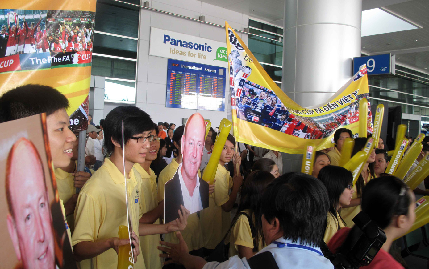 | Các CĐV Việt Nam chờ đón sự xuất hiện của Cúp FA tại sân bay Tân Sơn Nhất. |