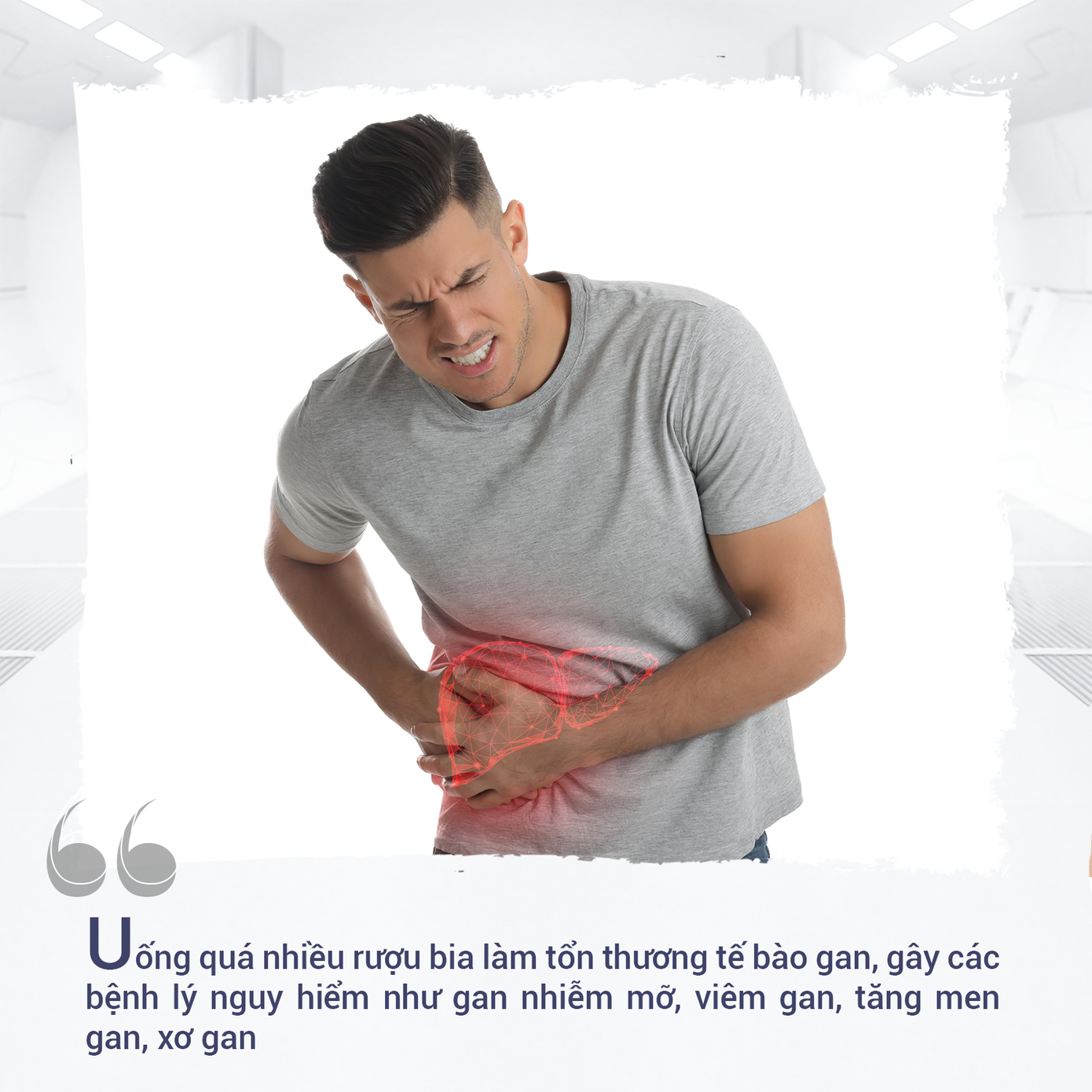 Đặc biệt, việc lạm dụng rượu bia thường xuyên sẽ làm từng tế bào của lá gan từ từ bị tổn thương. Bắt đầu từ việc tấn công, phá hủy tế bào gan, chất độc Acetaldehyde trong rượu bia khiến chức năng gan suy giảm, gây men gan cao, gan nhiễm mỡ, lâu ngày sẽ gây viêm gan, xơ gan do rượu. Mặc dầu nguy hại là vậy, nhưng nhiều nam giới vẫn “tặc lưỡi bất chấp” vì chủ quan, hoặc vì chưa thấy ngay những tác hại, cho đến khi được cảnh báo khi thăm khám.