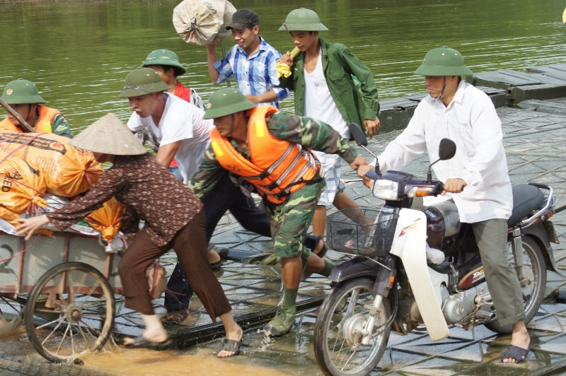 | Chiến sĩ công binh lắp cầu phao PMP 60 tấn, dài 160m giải tỏa ùn tắc giao thông. Ảnh: Nguyễn Minh |