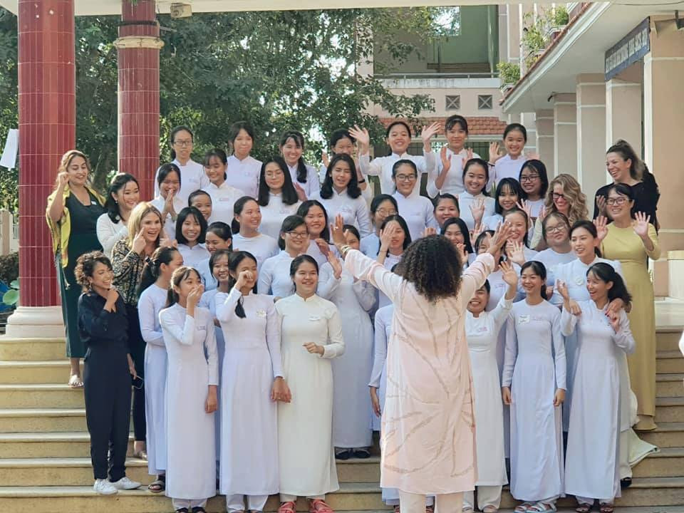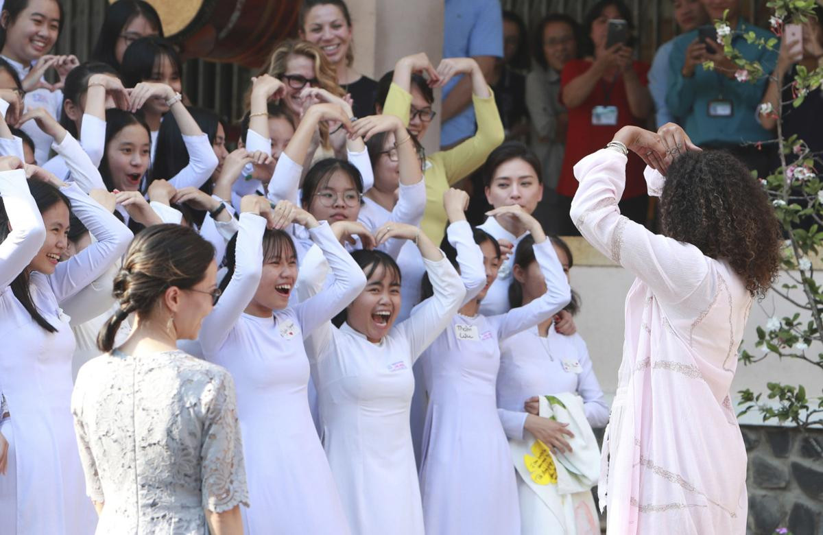 Ngay sau đó, bà Obama có chuyến thăm một trường trung học ở Cần Giuộc (tỉnh Long An) và hào hứng trò chuyện cùng các học sinh nữ.