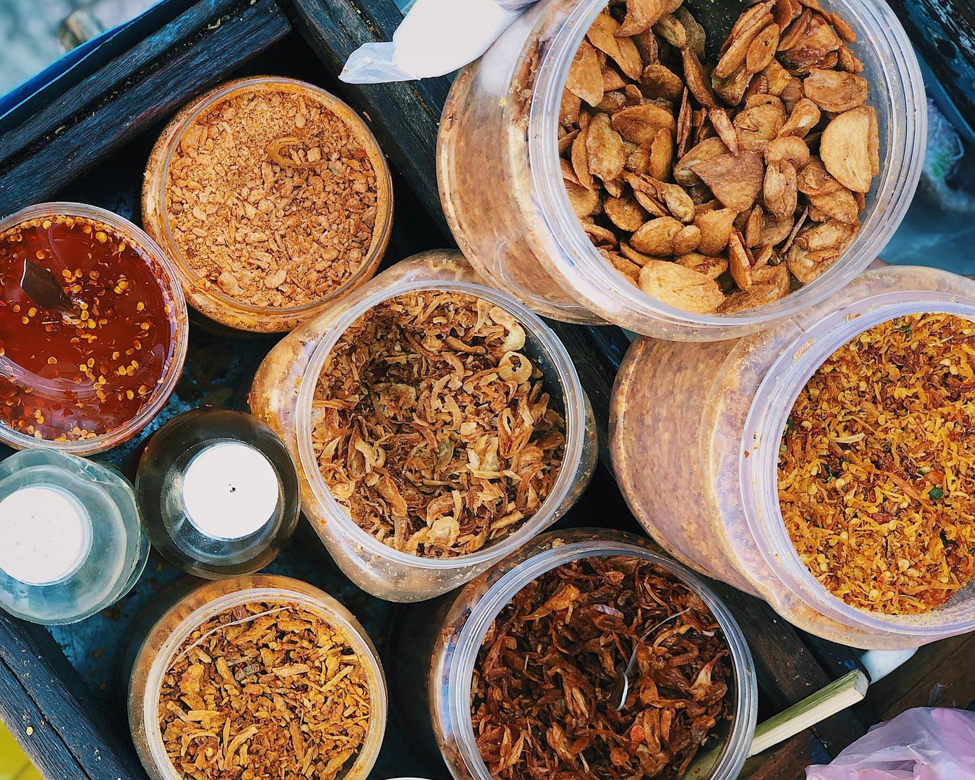 Bánh tráng trộn tỏi phi dậy mùi thơm bởi muối ớt tây ninh, hành phi, sa tế trộn đều với xoài bào, trứng cứt và vài lá rau răm. Điểm khác biệt so với món bánh tráng trộn nơi khác chính là những tép tỏi được phi ráo dầu trộn cùng. Trông có vẻ đơn giản mà ăn bao ghiền.