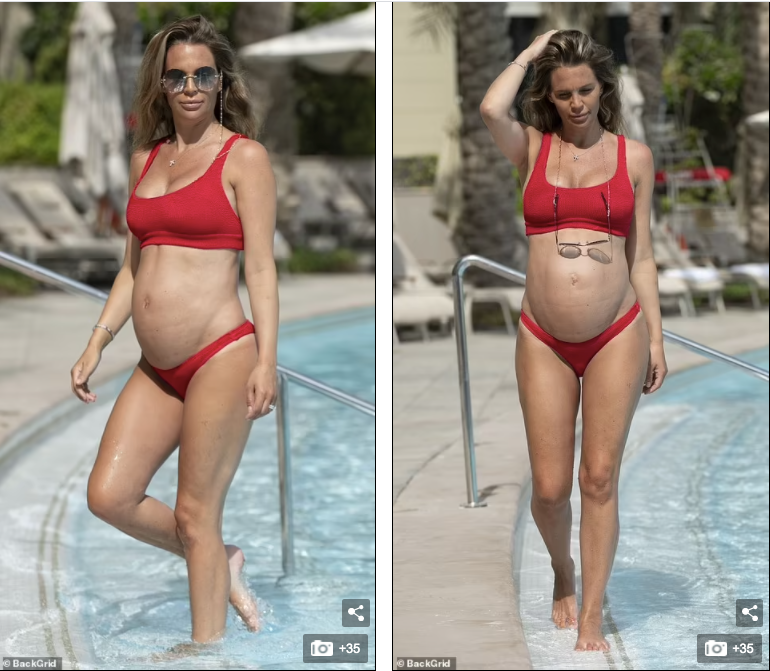 TPO - Danielle Lloyd diện bộ áo tắm 2 mảnh màu đỏ nổi bật bên bể bơi trong kỳ nghỉ cùng gia đình ở Dubai mới đây.