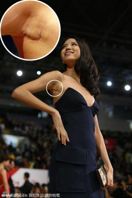 Tuy nhiên, trong lúc vẫy tay chào người hâm mộ, Trương Tử Lâm vô tình để lộ vết sẹo phần dưới cánh tay- dấu hiệu của nghi án nâng ngực.