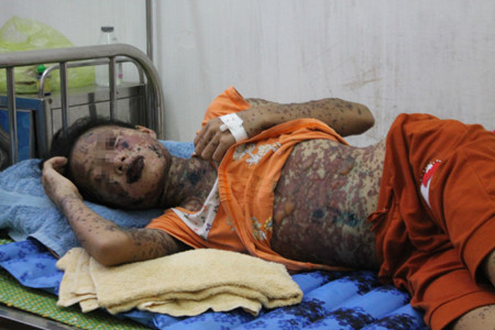 Các bác sỹ Khoa Lây – Truyền nhiễm quyết định để bệnh nhân ở lại, tập trung cứu chữa, hồi sức, cho truyền dịch, kháng sinh chống dị ứng và phối hợp với Khoa bỏng chăm sóc đặc biệt cho bệnh nhân. Sau 10 ngày chữa trị tích cực, đến nay các vết bỏng trên người bệnh nhân đã xẹp bớt, các vết thương bị vỡ đã bắt đầu se lại, bệnh nhân tiếp xúc tỉnh táo và đã có thể ăn được cháo.