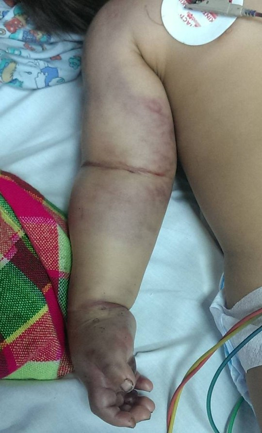 Trước đó ngày 4/4, Khoa Nhi, BV Bạch Mai tiếp nhận trường hợp bệnh nhi Vừ Mí Chá trong tình trạng sưng nề, tím đỏ trong cơ và dưới da, lan tỏa vùng cánh tay lan tới nách, nhiều nốt phỏng nước tím, xuất huyết nặng.