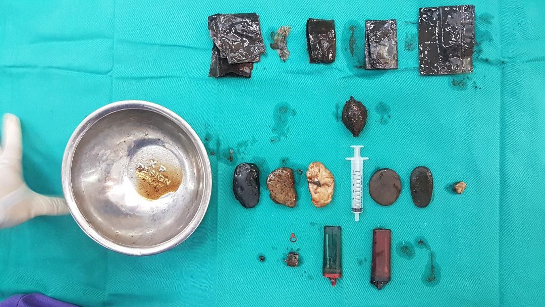 PGS.TS Nguyễn Đức Chính, Trưởng khoa Phẫu thuật Nhiễm khuẩn, người trực tiếp phẫu thuật bệnh nhân cho biết: “Qua hình ảnh nội soi, chúng tôi đã hình dung những vật dụng trong dạ dày người bệnh nhưng không ngờ nhiều và lớn đến như vậy. Khi mở dạ dày bệnh nhân thấy trong đó rất nhiều các cục dị vật lổn nhổn khác nhau, chúng tôi có cảm giác như mò đồ bỏ quên dưới biển. Từng khối dị vật được đưa ra khỏi cơ thể bệnh nhân, khi thì cái bật lửa, khi thì là viên đá, hòn sỏi, khi là túi nilon, hạt bàng…hầu hết màu đen do nằm lâu trong dạ phải mất hàng giờ đồng hồ chúng tôi mới lấy bỏ được toàn bộ ra khỏi dạ dày bệnh nhân “ - PGS.TS Chính chia sẻ.