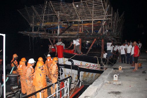 Tàu QNa 95889 TS cùng 32 ngư dân được đưa về cảng Nha Trang an toàn