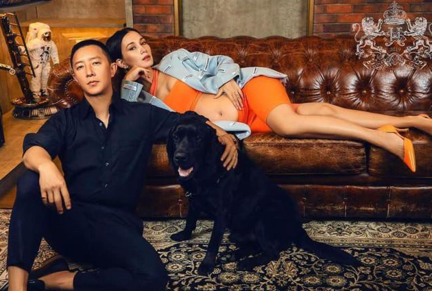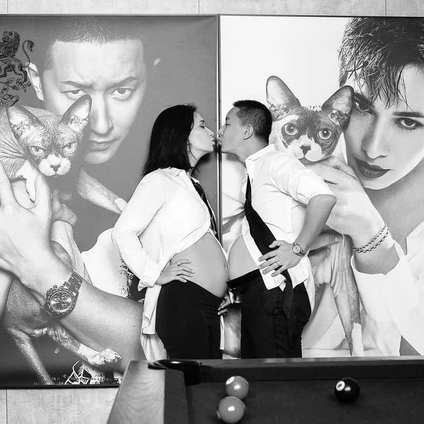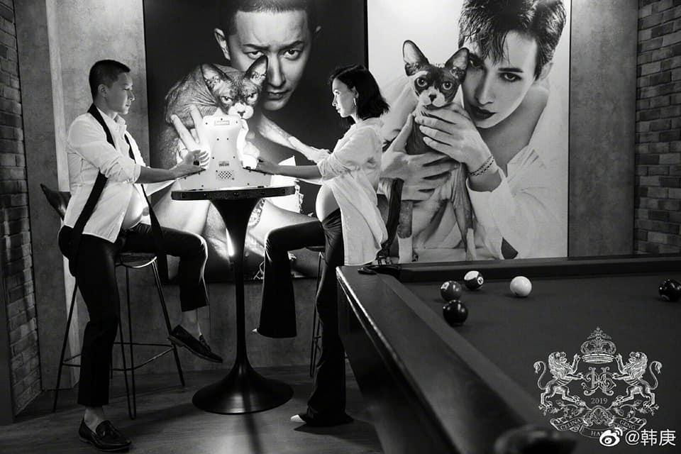 Trong bức ảnh được đăng tải, vợ chồng Hàn Canh tươi cười hạnh phúc, cùng diện áo sơ mi trắng khoe bụng bầu. Chỉ khác là bụng của Lư Tĩnh San là bụng bầu thật, còn bụng của Hàn Canh lại là hàng “pha-ke”.