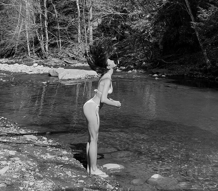 Trên trang cá nhân, cô thường xuyên cập nhật về chuyến đi. Gần đây nhất là loạt ảnh mặc đồ bơi xẻ ngực sâu tạo dáng bên suối.