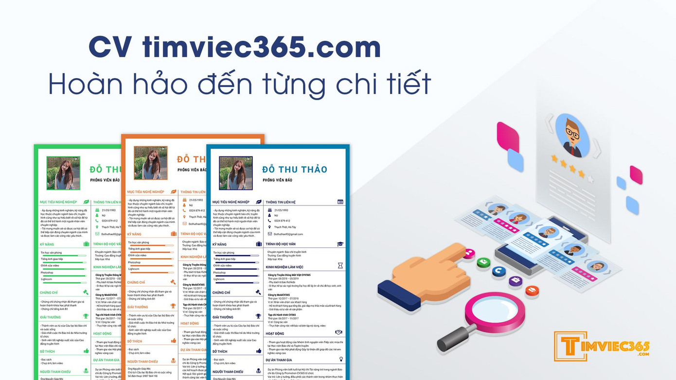 Đừng vội nản mà bỏ cuộc giữa chừng vì timviec365.com đã xuất hiện “như một ẩn số vàng” và giải quyết cho bạn hết những vấn đề đó. Sau khi nghiên cứu và tìm hiểu nguyện vọng của ứng viên cùng với yêu cầu của các nhà tuyển dụng thì timviec365.com đã cho ra đời một kho CV. Các mẫu được thiết kế đa dạng, ấn tượng, phong cách, hiện đại, cổ điển do các chuyên gia tâm lý, tuyển dụng nhân sự và đội ngũ thiết kế chuyên nghiệp của timviec365.com kiến tạo gợi ý.