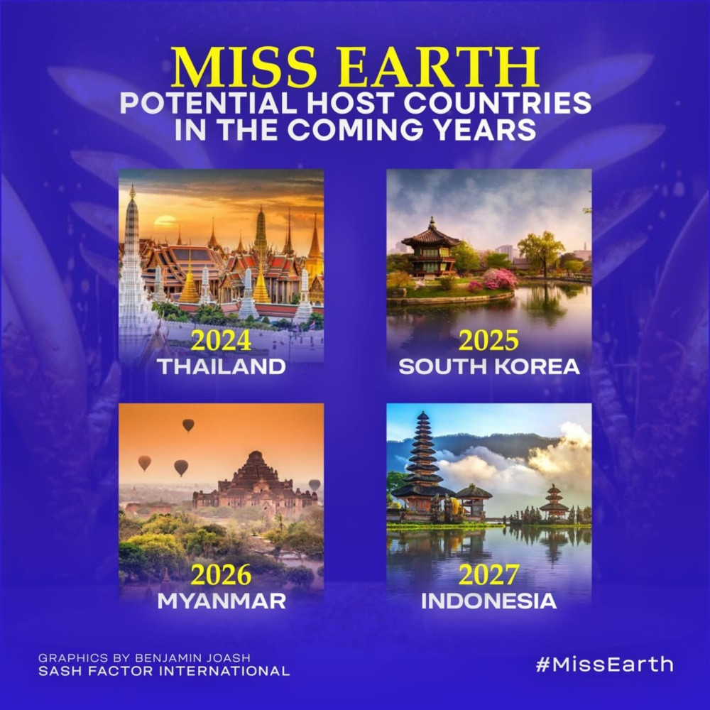 “Với rất nhiều phản hồi tích cực của fan sắc đẹp từ khắp nơi trên thế giới về khâu tổ chức cuộc thi Miss Earth tại Việt Nam, rất nhiều giám đốc quốc gia của cuộc thi này đã bày tỏ mong muốn được đưa Miss Earth đến với đất nước của họ. Và đây là danh sách một số quốc gia có thể sẽ tổ chức cuộc thi Hoa hậu Trái Đất trong 4 năm kế tiếp: