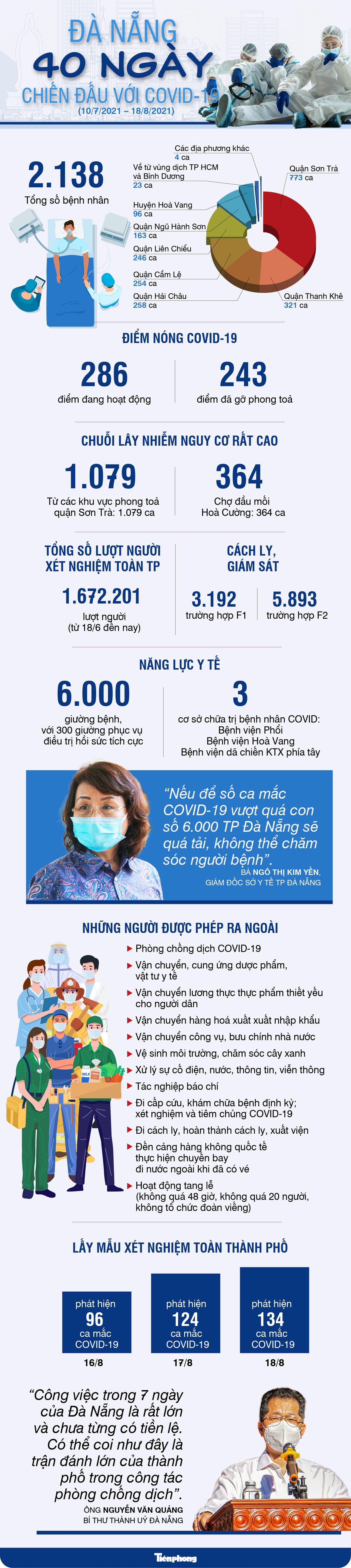 TPO - Đà Nẵng đã trải qua 40 ngày (từ 10/7) bùng phát dịch COVID-19 với 2.138 ca mắc. Cả thành phố Đà Nẵng thực hiện giãn cách trong 7 ngày đề thực hiện các biện pháp cấp bách phòng, chống dịch bệnh lây lan.