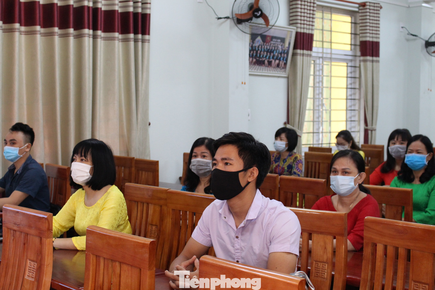 Lễ khai giảng đặc biệt chỉ với 20 thầy cô giáo, các thầy cô đeo khẩu trang liên tục và đảm bảo giãn cách suốt buổi lễ. Ảnh: Giang Thanh