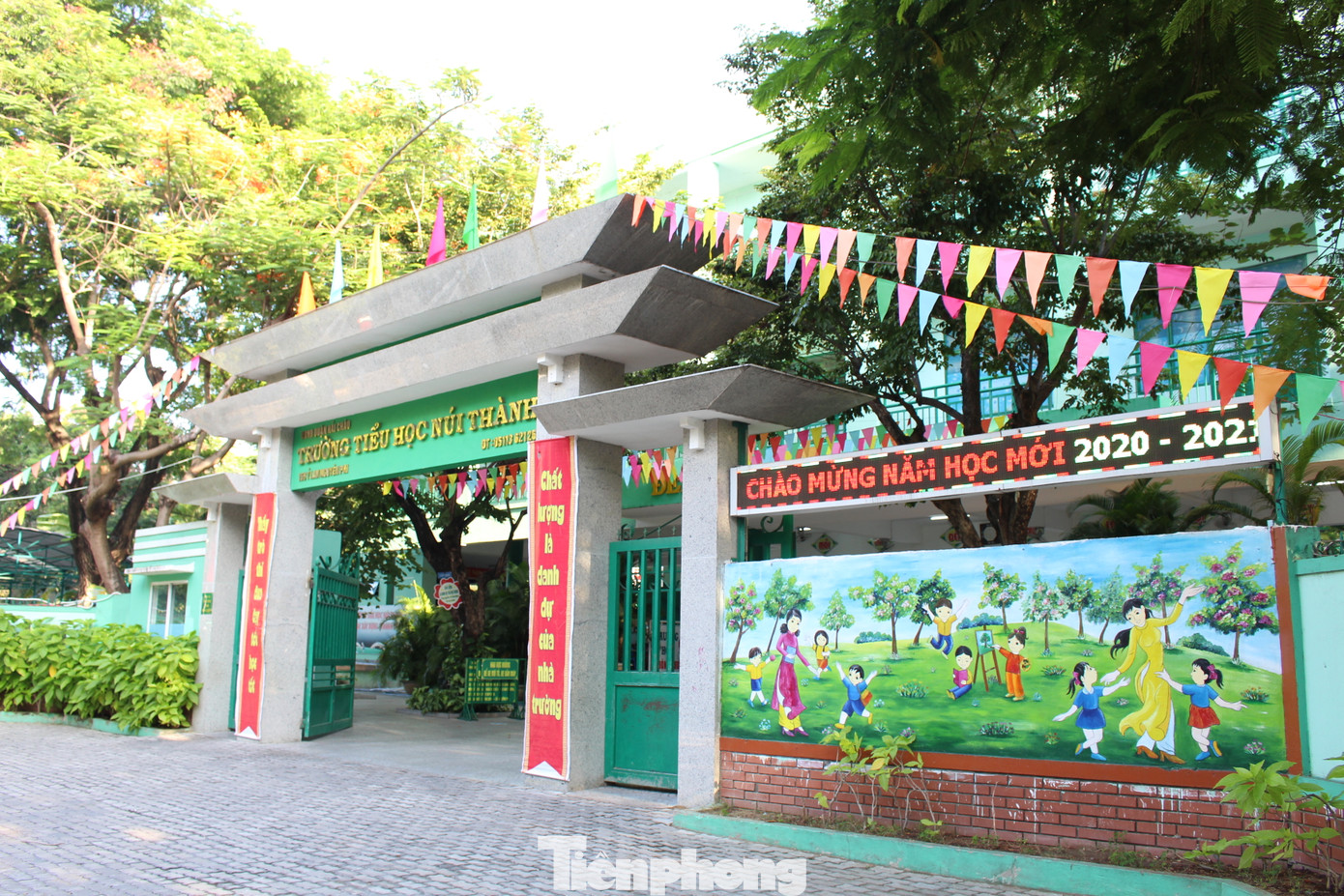 Trước cổng trường Tiểu học Núi Thành (quận Hải Châu) cũng căng đầy băng rôn và cờ để chào đón năm học mới. Tuy nhiên, lễ khai giảng năm nay của nhà trường của gói gọn trong quy mô 20 thầy cô giáo. Ảnh: Giang Thanh