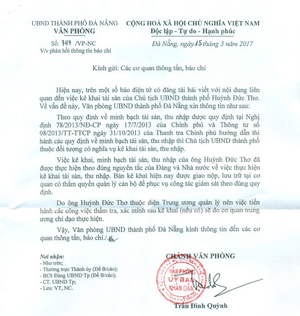 Trưa nay (15/3), Văn phòng UBND TP Đà Nẵng đã có văn bản số 747 phản hồi thông tin liên quan đến việc kê khai tài sản của Chủ tịch UBND TP Đà Nẵng, ông Huỳnh Đức Thơ. Văn bản do Chánh văn phòng UBND TP Đà Nẵng Trần Đình Quỳnh ký gửi các cơ quan thông tấn báo chí.