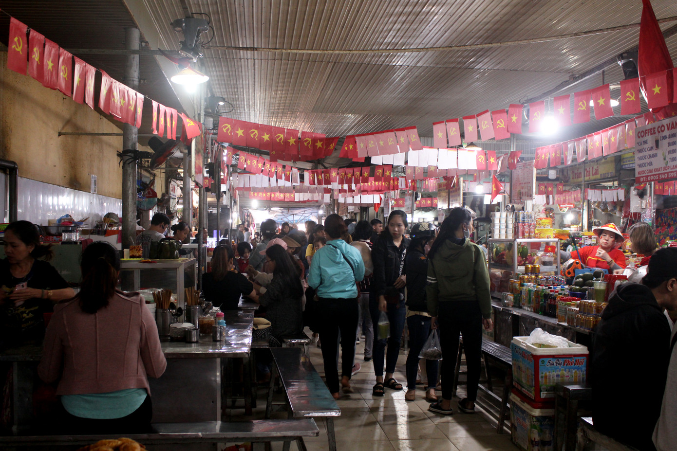 Chợ Bắc Mỹ An (quận Sơn Trà) cũng được các tiểu thương phủ đỏ bằng cờ Tổ quốc. Không khí ở đây hết sức náo nhiệt với những bài nhạc cổ vũ được phát liên tục cùng tiếng kèn vuvuzela rộn ràng.